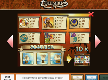Определяться со стратегией проще, зная диапазон доступных ставок. И возможности играть по-крупному в автомате Колумб реализованы идеально. На линию принимается до 100 кредитов. При этом минимальная ставка составляет только один жетон. Это делает азартный слот одинаково привлекательным как для новичков в гэмблинге, так и для слотхантеров, готовых рисковать, чтобы сорвать невероятный банк.