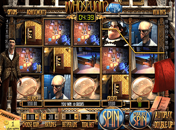 Игровой автомат WhoSpunIt поможет игрокам собирать улики во время спинов. Через каждый пять минут игры производится их подсчет и определяется количество фриспинов. Во время вращений геймерам предстоит определить, где именно произошло вопиющее преступление, каким оружием и указать на улику, которая и приведет к убийце. Для этого предназначены иконки с соответствующими символами. При выпадении комбинаций из них будет заполняться специальная шкала, когда она заполнится, станет доступен Скаттер, который активирует бонусный режим игры.